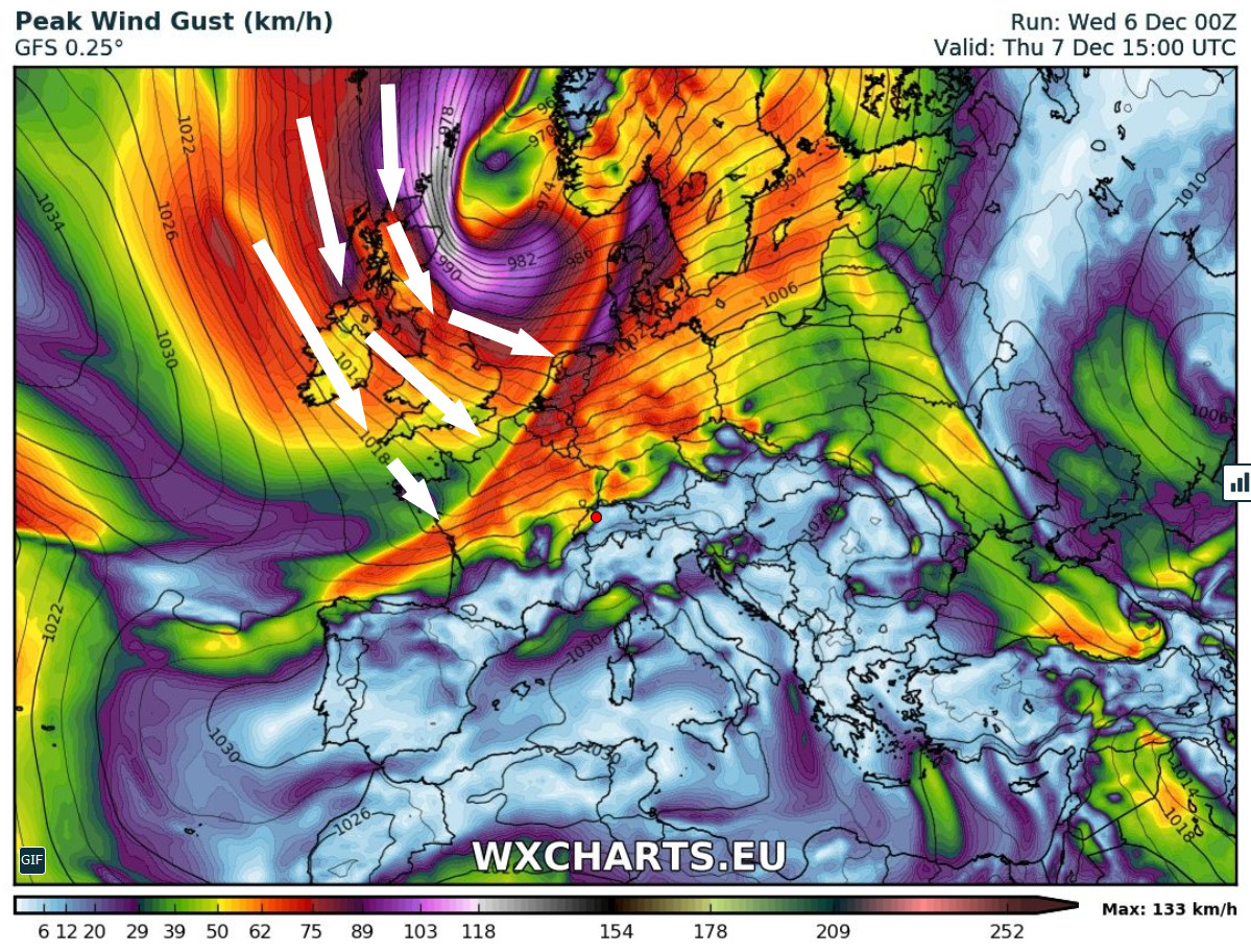 Und genau so ist es: Betrachtet man die Windkarte am Boden (Böen), so werden in Schottland und der Nordsee am Donnerstagmittag locker 120km/h erreicht (violetter und grauer Bereich). Das Tief zapft die kalte Luft im Norden an und "schmeisst" diese anschliessend in einem grossen Strom nach Mitteleuropa.![]()